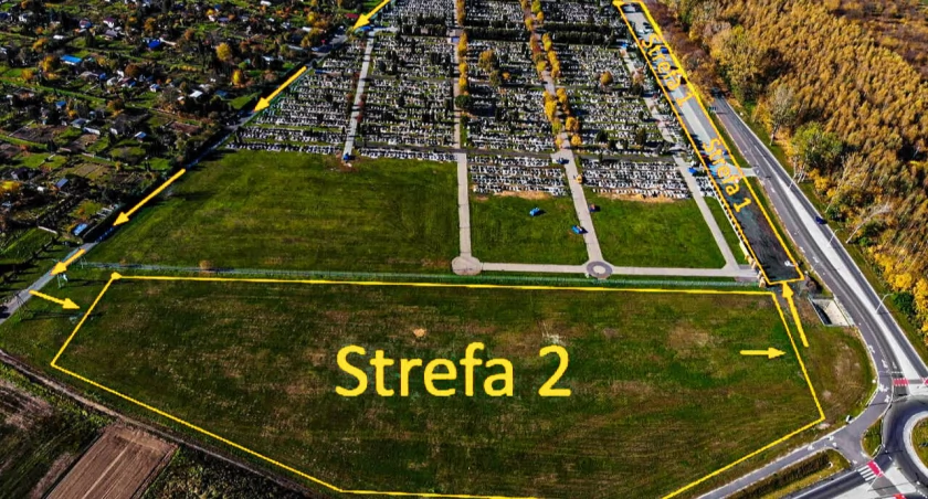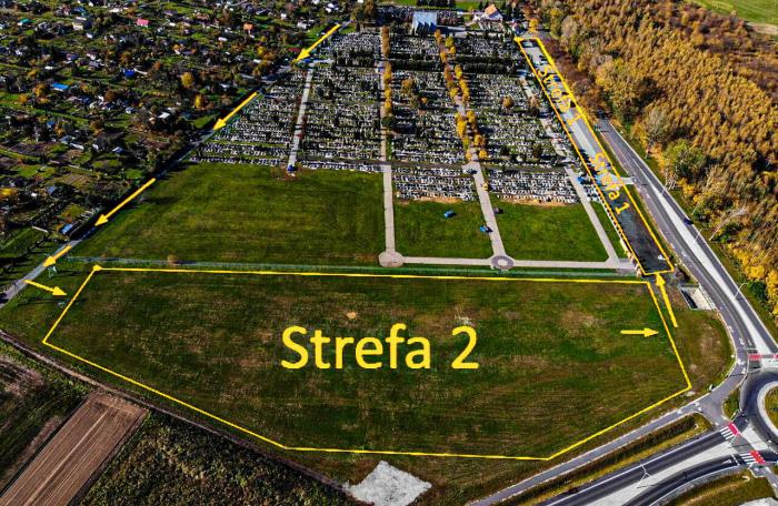 - Strefa 2: Dodatkowo udostępniony zostanie specjalnie wydzielony i oznakowany plac, zlokalizowany pomiędzy terenem cmentarza a obwodnicą.